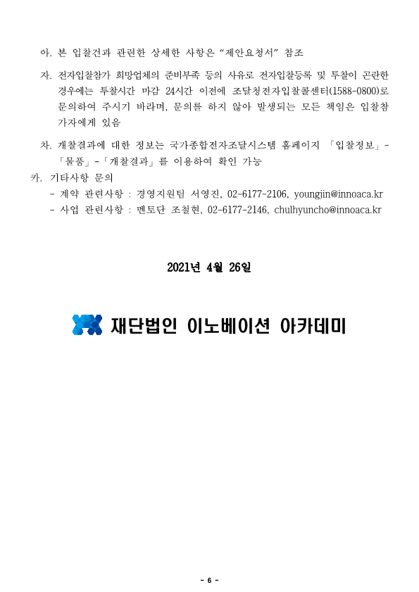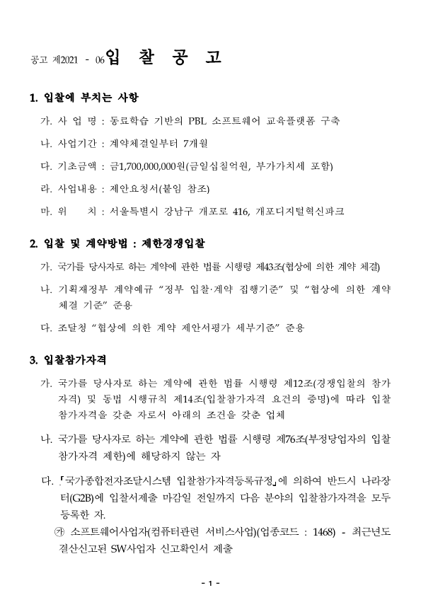 알림 입찰공고 재단동정 보도자료 공지사항 채용공고 입찰공고 설명회 신청 뉴스레터 신청 이노베이션 아카데미 재단 동료학습 기반의 PBL 소프트웨어 교육플랫폼 구축 용역 입찰 공고 작성일 : 2021-04-22 08:35:55 조회 : 5652 1618964148852_이노베이션 아카데미 재단 동료 학습 기반의 PBL 소프트웨어 교육플랫폼 구축 용역 입찰 공고.zip 이전 이전 게시물 보기 다음 다음 게시물 보기 목록